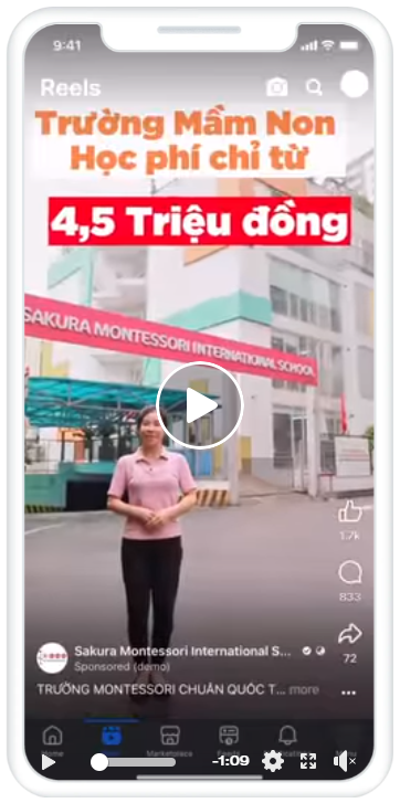 Để thu hút sự chú ý từ các bậc phụ huynh am hiểu về mạng xã hội, đội ngũ Sakura Montessori đã bổ sung quảng cáo trên Reels bên cạnh loại quảng cáo họ thường sử dụng là quảng cáo click đến Messenger. Reels là vị trí quảng cáo video dạng ngắn, mang lại trải nghiệm xem chân thực và thú vị. Với niềm tin rằng phụ huynh thường chú trọng nhất đến cơ sở vật chất và chất lượng giáo dục khi chọn trường cho con, đội ngũ Sakura Montessori đã ra mắt chiến dịch nội dung giới thiệu môi trường học tập của trường.
